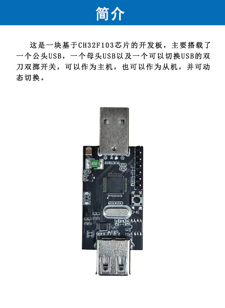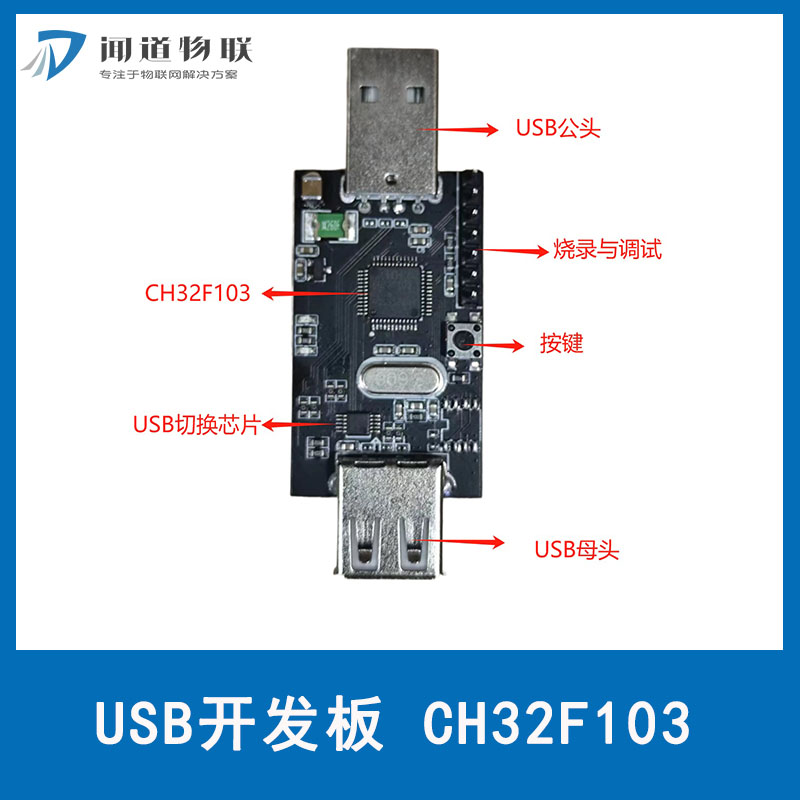 CH32F103C8T6评估学习板 作者 闻道物联 这是一块基于CH32F103C8T6的USB开发学习板,搭载了一个公头USB,一个母头USB和一个USB切换芯片 ,即可以作为USB HOST也可以作为从机