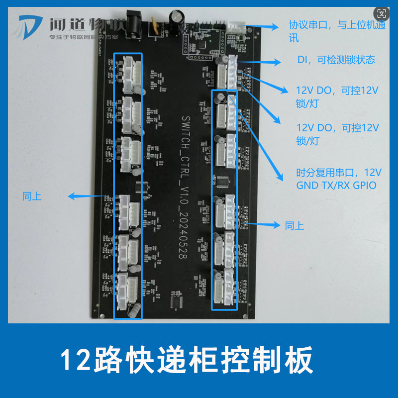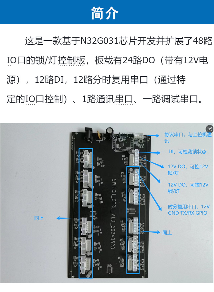 12路/24路快递柜控制板 作者 闻道物联 这是一款基于N32G031芯片开发并扩展了48路IO口的锁/灯控制板,板载有24路DO(带有12V电源),12路DI,12路分时复用串口(通过特定的IO口控制)、1路通讯串口、一路调试串口。
